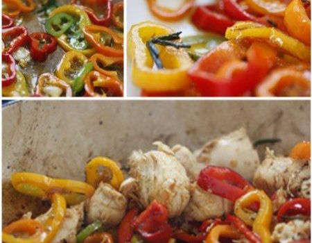 - מחממים שמן זית במחבת כבדה ורחבה על אש גדולה. מוסיפים את פרוסות הפלפלים המתוקים והחריף. מטגנים תוך כדי ערבוב. מוסיפים פרוסות שום ורוזמרין. מטגנים עד שהפלפלים מקבלים צבעים זרחניים ומודגשים ומתחילים להתרכך, מבלי שישחימו. מוציאים את פרוסות הפלפלים והשום לצלחת.