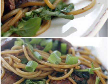 - מוסיפים בצל ירוק ופסטה שסוננה ממי הבישול ומערבבים מהר ובעוצמה, עד שכל הפסטה מכוסה בסילאן ובמיצי הכבדים. מורידים מהאש.