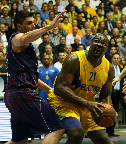 סופוקליס שחורציאניטס בדרך לעוד סל מול ויטוריה (צילום: אלי אלגרט)