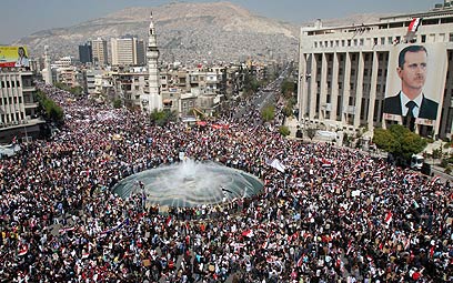 "בדמנו, בנפשנו, נקריב את עצמו בשביל בשאר", שרו המפגינים שהגיעו לכיכר המרכזית של דמשק ברגל ובאוטובוסים. "אלוהים, סוריה, בשאר וזה הכל. אחד, אחד, אחד, יש רק עם סורי אחד".