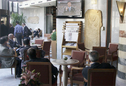 "ניסינו שלא לפגוע באזרחים סורים". בדמשק צופים בנאום אסד (צילום: EPA)