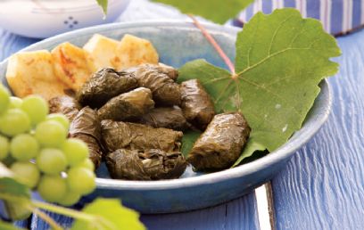 עלי גפן ממולאים אורז וצנוברים, מבושלים ביין מוסקט