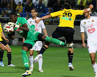 אינוגבה הודף כדור מעל ראשו של קולאוטי (צילום: אלי אלגרט)