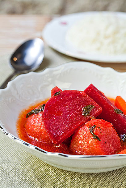 5 סלקים בינוניים, קלופים וחתוכים לחצי ואז לפלחים (חצאי ירח) בעובי של 1 ס"מ