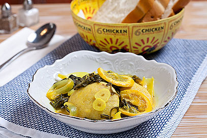 - מוסיפים את עלי המנגולד, עלי הסלרי הקצוצים ופרוסות הלימון. משפרים תיבול ומביאים לרתיחה שניה.