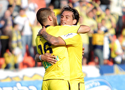 בוזגלו ועטר חוגגים. שניהם החמיצו פנדלים (צילום: אורן אהרוני)