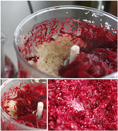 - מעבירים את החזרת הטחונה לקערה. מוציאים את הסכין של מעבד המזון ומרכיבים במקומו את דיסקית הפומפייה הדקה. מגררים את הסלק בדיסקית הזו ומוסיפים לחזרת שבקערה. אפשר לגרר את הסלק גם ביד על פומפיה דקה, אבל בשום אופן לא לטחון בסכין של המג'מיקס. חזרת טובה צריכה להיות בעלת מרקם גס ולא כזה שמזכיר אוכל מרוסק לתינוקות.