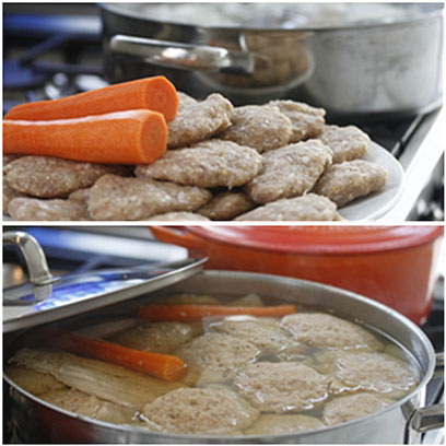 - קציצות ברוטב: בעדינות ובזהירות מסדרים את פרוסות הדגים או הקציצות בסיר. מניחים את אדרות הדגים מעל השכבה הראשונה של הקציצות או הפרוסות ומעליהן מסדרים בעדינות שכבה נוספת. מעל הכל מניחים את הגזרים בשלמותם. מכסים ומביאים לרתיחה. מנמיכים את האש ומבשלים מכוסה במשך שעתיים תוך שמירה על רתיחה מתונה.