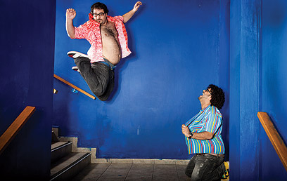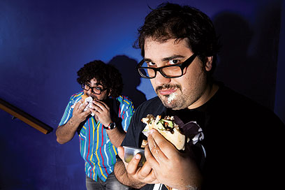 אני נכנס פנימה אחריהם. כחבר, אבל גם כעיתונאי, מתברר לי שאני נהנה מאוד לראות את האהבה שהם מקבלים. לפני שלוש שנים, כשהתוכנית ההיא שודרה בביפ, הייתי בעצמי בתחילתה של התלהבות כזאת. לא היסטריה המונית, אבל בואו נגיד שהליכה בקניון לוותה בדרך כלל בעצירות לתמונות. ועכשיו נוח לי. נוח שהם במרכז, ואני יכול ללכלך את הפנים בשני סוגי שוקולד בלי שמישהו ירצה פתאום להצטלם איתי. ויש בר פתוח - עם ג'יימסון, לא איזה וודקה חרבות - ואני נותן בשוטים. כשאני מסתובב להעביר אחד לטל, הוא עסוק בלחשוב מה לכתוב למישהי על החזה. וזה עוד לפני "קומדי סנטרל". זה כשהם מוכרים רק מיוטיוב.