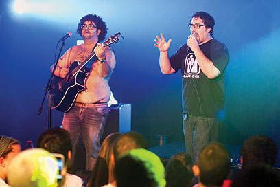 עוד שוט והם עולים לבמה. טל באמת מלא כוח. הוא נותן את "גבר שמן עם משקפיים" ואת "ילדה רעה" כאילו הרגע התעורר משנת צהריים. כל המוג'ו שלו יוצא, והחבר'ה בקהל מתלהבים. מניפים אצבעות, שרים מה שמכירים, צוחקים הרבה. אבל שני שירים אחר כך הוא גמור כמו זקנה במדרגות. מתיישב בצד על מעקה קטן, שר משם. כשהוא עושה ברייקדאנס ב"שיר ראפ", הוא נשאר על הרצפה הרבה יותר מדי זמן. ליורן, לעומת זאת, חסר רק אריק אינשטיין כדי להיראות כמו סצנה מ"שבלול". מנגן, לא מפספס שום קיוּ, שר. לרגע לא תדעו שהוא קודח מבפנים.
