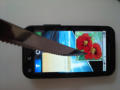 סכין הסטייקים בו השתמשנו לא עשה אפילו שריטה. המסך, מטיפוס Gorilla, עמד בניסיון בכבוד. ביצענו לו גם דיקור סיני בגירסה ביתית: שדכן משרדי. מסך המכשיר ספג עשר סיכות ללא שריטה אחת. קחו בחשבון שהבדיקות לא נעשו על גב המכשיר. כנראה שהגוף עצמו היה עומד בהן פחות בכבוד. עם זאת, שריטה על הגב לא תמנע מכם מלהשתמש בסמארטפון.