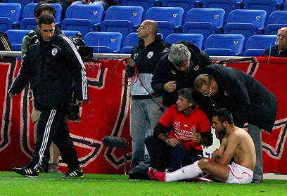 שכטר לאחר פריקת הכתף מול עכו (צילום: אלי אלגרט)