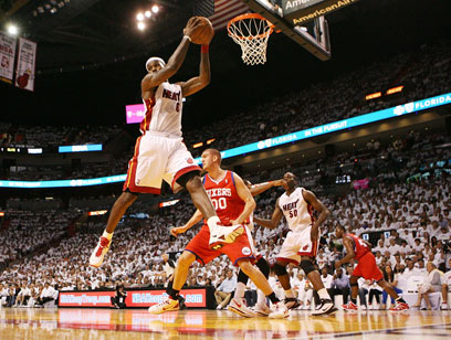 גם מיאמי היט, המדורגת שנייה במזרח, הזיעה לא מעט בביתה לפני שעלתה ליתרון 0:1 בסדרה מול פילדלפיה סיקסרס. על אף שכבר הובילה ביתרון דו ספרתי בפתיחת הרבע האחרון, ניצחה המארחת רק 89:97. יש לציין שההיט התאוששו מפתיחה נוראית למשחק, אולי בשל התרגשות פלייאוף מסוימת. פילדלפיה ניצלה זאת ל-19:31 ברבע הראשון. לברון ג'יימס וכריס בוש הנהיגו את הקאמבק של המארחת.