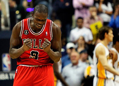 לואל דנג חוגג ניצחון של שיקגו בשיניים (צילום: MCT)