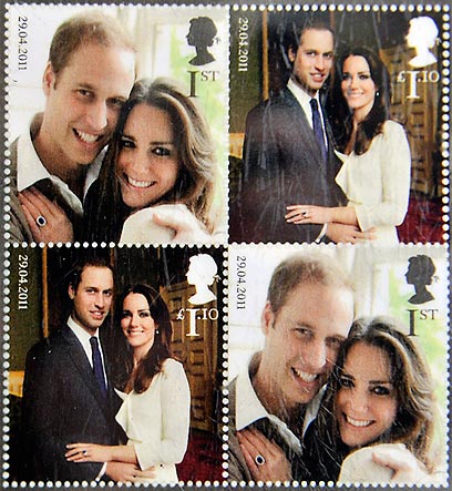 "אנו הנסיכים והגננות, האמא והבן, הפילגש והחברה". הזוג המלכותי על בולים בריטים (צילום: אי.פי.איי)