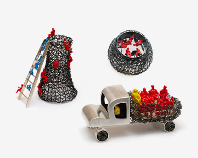 המעצבת אוהדה האי-גורדון מציגה את בבואות - עבודה עשויה מחוטי ברזל, כסף 925 , זהב 14k, פנינים, ודמויות פלסטיק Ready Made.