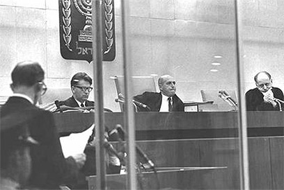 לנדוי מול הפושע הנאצי אייכמן. "משימת חייו" (צילום: לע"מ)