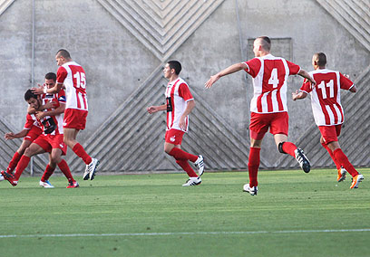 אבו לאבן ושחקני באר שבע חוגגים את היתרון הזמני (צילום: אורן אהרוני)