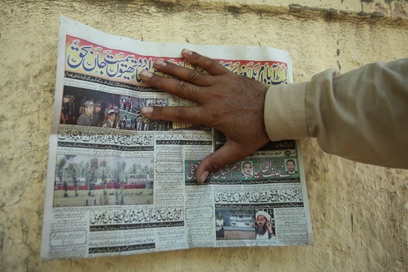 שכנו של בן-לאדן עם העיתון המדווח על מותו (צילום: צור שיזף)