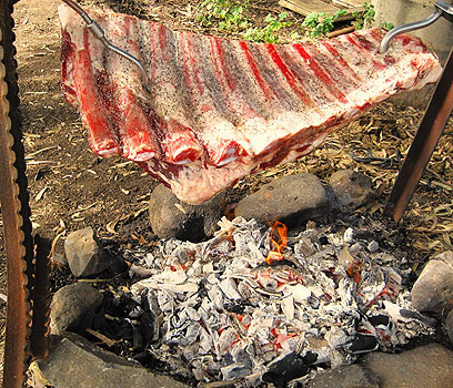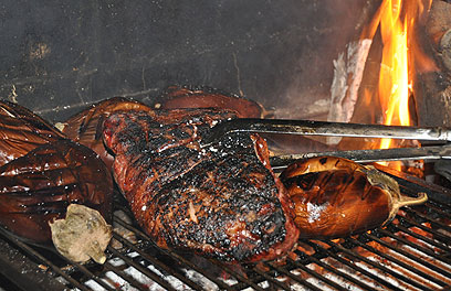 דיבורים כמו חול ואין מה לאכול, נזכרתי בפתגם מימי נעוריי, תוך שאני מכוון אותו בין הפרות והעגלים חזרה לבקתה. על הגריל הונח שפיץ צ'ך במשקל של כ-2.5 ק"ג שהבוקרים הברזילאים מכנים אותו פיקאניה. הוא נצלה בהתחלה על הרשת הנמוכה מכל צדדיו, והתרומה היחידה שלי הייתה שעשיתי חריצים בצורת שתי וערב על הצד השמן ושפשפתי אותו במרץ במלח ים. אחרי כ-20 דקות של צלייה הסטנו אותו לצד הגריל והזזנו את הפחמים מתחתיו, כך שייצלה בחום עקיף רק מהצד. נתנו לו כשעה, תוך שאנחנו הופכים אותו מפעם לפעם.