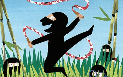 האיורים של הנינג'ה מורכבים כקולאז'ים של ניירות בגוונים, הדפסים ומרקמים שונים, שלמרות המינימליזם שלהם, מצליחים ליצור עולם עשיר ואקזוטי. במיוחד נעים לראות עד כמה קל ליצור דמות מובחנת וברורה ממספריים וגליון נייר שחור. כל עושה פיליפס כשהיא מופיעה בפני תלמידים ומספרת על העבודה שלה ומעודדת אותם"לעשות נינג'ה" בעצמם. אפשר בהחלט אפשר ליצור אותם גם בלעדיה, וכך לגלות שהלוחם והחולם הביתי יחזור אל הסיפור הזה שוב ושוב.
