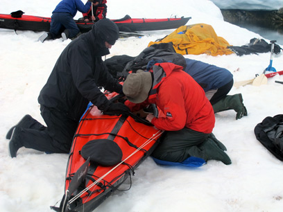 ביום שלמחרת הרכבנו את הקיאקים המתקפלים מסוג Feathercraft על גבי מצע השלג. כשרוחות עזות נושפות, נושבות ומקפיאות את עצמותינו, הצלחנו לחבר חלק לחלק ולהרכיב ארבעה קיאקים מוכנים לקראת המשימה. זו הייתה מלאכה מייגעת ובסופה קשרנו את הקיאקים לסלעים, שבלטו מעל פני השלג וחזרנו באמצעות סירת הזודיאק לחיקה של היאכטה ולבישוליהם המדהימים של הסקיפרים, קרי וגרג.