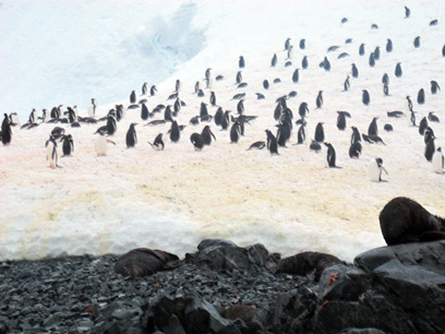 קולוניית פינגווינים מנקדת את מעלה ההר
