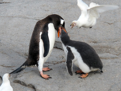 זו חלקת הארץ של החיות. האכלת גוזל פינגווין תוך כדי איום
