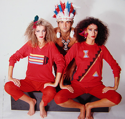 ראש אינדיאני: התזות צבע ואיורים על דגמי דנים, בהשראת ציורי הגרפיטי של קית הרינג. מתוך הספר "שיכרון עיצובים - אמנות האופנה בישראל 1948-2008" של נורית בת-יער (צילום: מולה עשת)