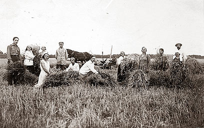 8. הכשרה "למטרה" טקלינופול 1932, מתחת לערימות החציר: במרכז - אמי במטפחת לבנה, עם הפריץ הפולני בעל החווה.