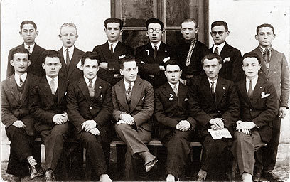 13. יוזפוב שעל הוויסלה - 1931-1930. חברי הוועדים של ההסתדרות הציונית "השומר הלאומי" ו"החלוץ" עם שליח המרכז פנחס קמינר. 1- אבי, ישראל מלברגר, 2- גיסו וחברו של אבי אהרן קליינמאן שנרצח בשואה.