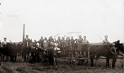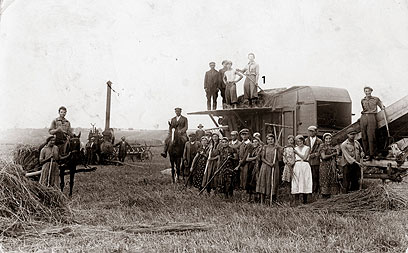 18. "השומר הלאומי" פולניה, קיבוץ "כרמל" בעיר סולץ, 1932, ליד מכונת הדייש עם מנוע קיטור. 1- אבי, ישראל מלברגר - ראש קבוצת ההכשרה לקראת העליה ארצה.
