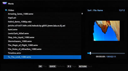 2 כניסות USB + חיבור רשת LAN לצפיה בתמונות, האזנה ל-MP3 וצפייה בתכני וידאו MKV / MTS / M2TS / AVI / MPEG1/2/4, DivX