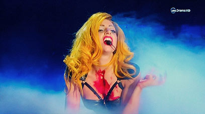 ליידי גאגא בהופעה של HBO מורחת על עצמה צבע אדום חזק ומשלבת את זה עם שיער צהוב צעקני. ההופעה מלאה שילובי צבעים צועקים לעין וגם קטעים חשוכים בשילוב ערפל בצבעים. כאן חדות התמונה וגוון צבע חזק מביאים לתוצאה שמחה שתואמת את המסר אותו מביאה ליידי גאגא בהופעתה.