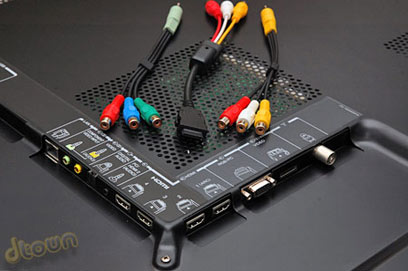 החיבורים מאחור ממוקמים כפי שצריך להיות במסך דק שכזה - עם הפנים כלפי הצד ולא לאחור. בחלק מהמקרים יש לחבר מתאם שכולל מחבר קטן קוטר בצד שמתחבר למסך ומחבר סטנדרטי בצידו האחר – עבור חיבור לכבלים רגילים. פירוט החיבורים בהמשך הכתבה.