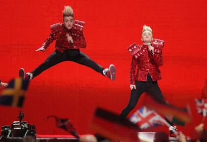 הלהקה הכי מפורסמת על הבמה, לפחות כזו שהמעצב(נ)ת עוד מכירה, היתה להקת הבנים הבריטית בלו, שייצגה מן הסתם את בריטניה. אם לא נתעכב על טעמה המוזיקלי של המעצב(נ)ת, זו התלהבה מאוד מסידורי האבטחה שהיו על הבמה. אלא שאז גילתה שהמאבטחים גם יודעים לשיר ושבכלל מדובר בחברי הלהקה. כן, הבנו שאתם לובשים כחול והבנו שנורא אוהבים אתכם, זו לא סיבה להתלבש ככה. אפילו בית האופנה של הערסים המכובדים ביותר לא מחזיקים בגרדרובה כזו. ולא, ריבועים בבטן זה לא אקססוריז.