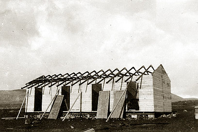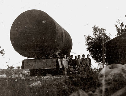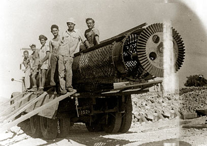 19. הנפה למחצבה אותה בנה פרול במסגריה בחיפה. לאחר הבאתה למלכיה היא הוצבה על בסיסה בעזרת חבלים וגלגלות.