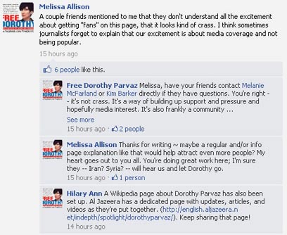המאמצים לקידום סיפורה של פרוואז מכוונים לעיתונאים בעלי חשבון בטוויטר או בפייסבוק - כלומר, כמעט לכולם - ויש רבים שסוקרים את הרשתות החברתיות בחיפוש אחר הסקופ הבא. ככל שקיימים עוד ועוד חברים בעמוד המטרה בפייסבוק ועוד משתמשים שמצייצים בנושא freedorothy#, המסר נקלט באופן ברור יותר בראדר של העיתונות. ככל שיותר גורמי תקשורת גדולים יפנו זרקור לסיפור, מקווים חבריה של פרוואז, איראן לא תוכל להתחמק ממתן תשובות ותשחרר את העיתונאית ממעצרה.