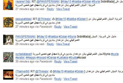 יום הנכבה העסיק את המולטיספירה. בטוויטרספירה הערבית נפוצה שמועה, שמקורה אולי במיסאינפורמציה מכוונת שנועדה לזרוע בהלה בקרב הישראלים, שלפיה צה"ל דיווח על שני חיילים שנחטפו במג'דל שאמס.