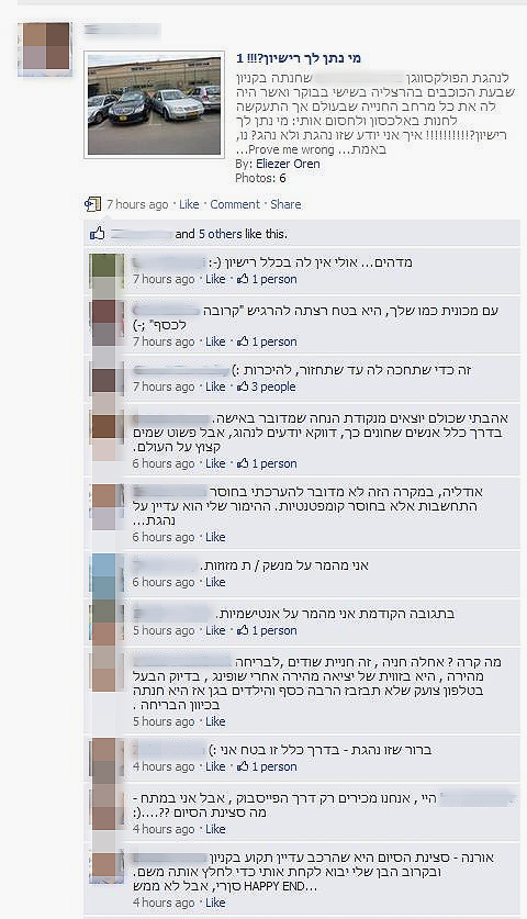 אודליה בנאי, האישה הראשונה שהגיבה לפוסט, העירה: "אהבתי שכולכם יוצאים מנקודת הנחה שמדובר באישה. בדרך כלל אנשים שחונים כך לאו דווקא לא יודעים לנהוג אבל פשוט שמים פס על העולם". אבל אורן ענה: "אודליה, בנקודה הזאת לא מדובר, להערכתי, בחוסר התחשבות אלא בחוסר קומפטנטיות. ההימור שלי הוא עדיין על נהגת". כשמישהו אחר המשיך לטעון שמדובר בחניה מקצועית מדי בשביל אישה, אורן התעקש על ההימור שלו, בטענה ש"הרכב ממש נוגע ברכב שלי. בואנה, זה נשמע עכשיו כמו עדות ממשפט קצב". אחד החברים כתב: "אני מהמר על מנשק/ת מזוזות".