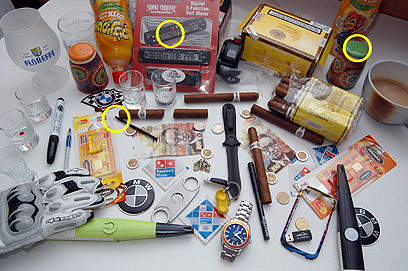 קודם כל רואים ברור שהשעון מעורר (או הטיימר) שיחקו עם שני האפסים הראשונים כי אין מקום להכניס שם am/pm ברור ששונה הכפתור של מצת הימני עוד דבר פרופרציה של הסיגר החתוך מראה שהוא קטן יותר מסיגר רגיל מחובר אז זה לא שני חלקים בנוסף נראה ששונה החישוק הצהוב שמקיף את שעון האומגה כי היחס של המספרים לא נכון לא יכול להיות ש20 מתחיל אחרי רווח כל כך גדול וגם אין מקום מ50 ל60 כנראה שהמשולש עם הנקודה הוזז (מקווה שתבינו את הכוונה) בטוש השחור הצופציק לא אמור להיות למטה בסמוך לפתיחה של הטוש, הסכין לא הגיוני שהתופסן נמצא בצורה כזאת על הידית של הסכין הוא צריך להיות על הנרתיק הכיתוב פינלנדיה נמחק מאחד הכוסות זכוכית, נראה לי שבעט השקוף אמור להיות מילוי כלשהו, לא מצליח לראות אבל נראה לי שחסר הצופציק של המצת השחור מה שעושה את הניצוץ ככל שאני מכיר כיסוי איפוד אמור להיות עם תחתית כזאת, ואחרון חביב לא בטוח אני לא מכיר קוצץ סיגרים אבל נראה לי שהסכין באמצע לא צריכה להיות סגורה שלא לוחצים על החורים בצדדים ( רפי) שלום רפי. אני על לוסטרל 100 - נראה לי ששווה שתעבור אצל חיליק הפסיכיאטר שלי והוא ישתף אותך גם.