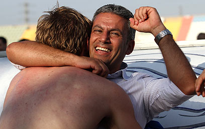 מאיר כהן והחברים חוגגים עם שריקת הסיום (עוז מועלם)