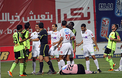 מחמד קנדיל על הדשא, שחקני סכנין ובית"ר מתקוטטים (צילום: חגי אהרון)