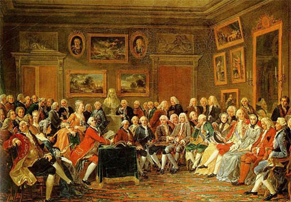 עידן האורות: הוגים משוחחים ומחליפים דעות בסלון צרפתי (Anicet Charles Gabriel Lemonnier 1812)