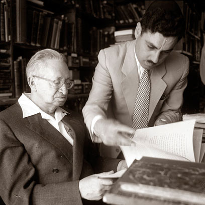 4. יצחק בן-צבי חקר משך חייו את קהילות ישראל ומקורותינו הכתובים והארכיאולוגים. בתצלום: עם מאיר בניהו (בנו של הרב יצחק ניסים) חוקר הקבלה והשבתאות.