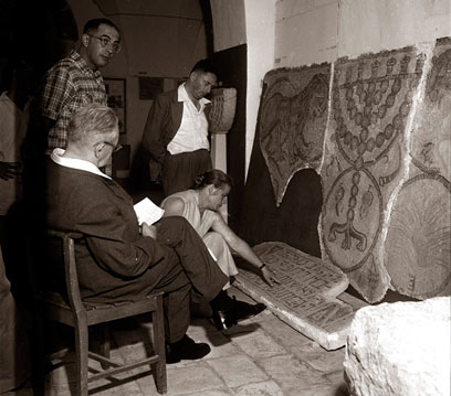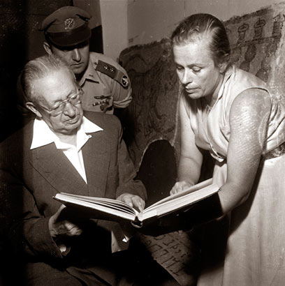 6-5. בן-צבי ליד פסיפס מנורת ישראל. לידו רות הסטרין - ארכאולוגית שעבדה במוזיאון ישראל שנים רבות.
