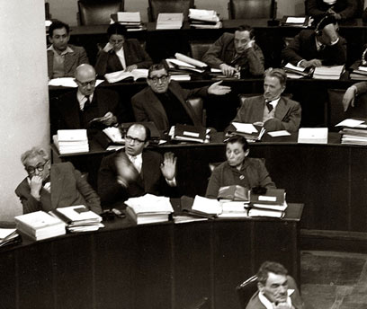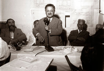 12. חודש יולי 1957, יו"ר הכנסת, מר יוסף שפרינצק (עומד) מביא לדיון הקמת מבנה חדש לכנסת ישראל. מימין בכור שטרית - שר המשטרה, וחבר הכנסת בנימין מינץ, סגן יו"ר הכנסת.