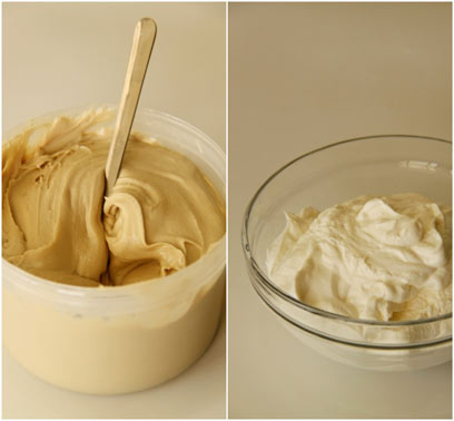 - המלית: בקערת המיקסר עם וו גיטרה מערבלים את הגבינות עם הסוכר. מוסיפים את ממרח החלבה ומערבלים היטב עד להטמעה. מוסיפים את הביצים. בכל פעם ביצה אחת, מערבלים בכל פעם היטב עד שהביצה נבלעת בתערובת. מוסיפים את הליקר ואת השמנת המתוקה ומערבלים שוב (במידת הצורך יש להעביר מרית בתחתית הקערה על מנת לוודא שהתערובת אחידה).
