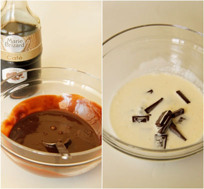 - הציפוי: בקערה חסינת חום מניחים את השוקולד. בסיר קטן מביאים לרתיחה את השמנת המתוקה, מסירים מהאש ומיד יוצקים על גבי השוקולד. מניחים למשך דקה אחת ומערבבים היטב עד להמסה מלאה של השוקולד. מוסיפים את ליקר הקפה ומערבלים היטב.
