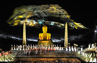 שובל נחשי של עשרות אוטובוסים התפתל אמש (ג') במדבר בואכה ים המלח. מכל קצות ארץ התכנסו למרגלות המצדה, כדי לצפות באופרה "אאידה" של ורדי בהפקת הענק של האופרה הישראלית. אם מתעלמים לרגע משלטי החסות הענקיים (שהשנה, בניגוד לשנה שעברה, מצליחים להיטמע במרחב בזכות העיצוב הנבון), בכניסה למתחם מתחזקת התחושה שהגעת למקום ולזמן אחר.